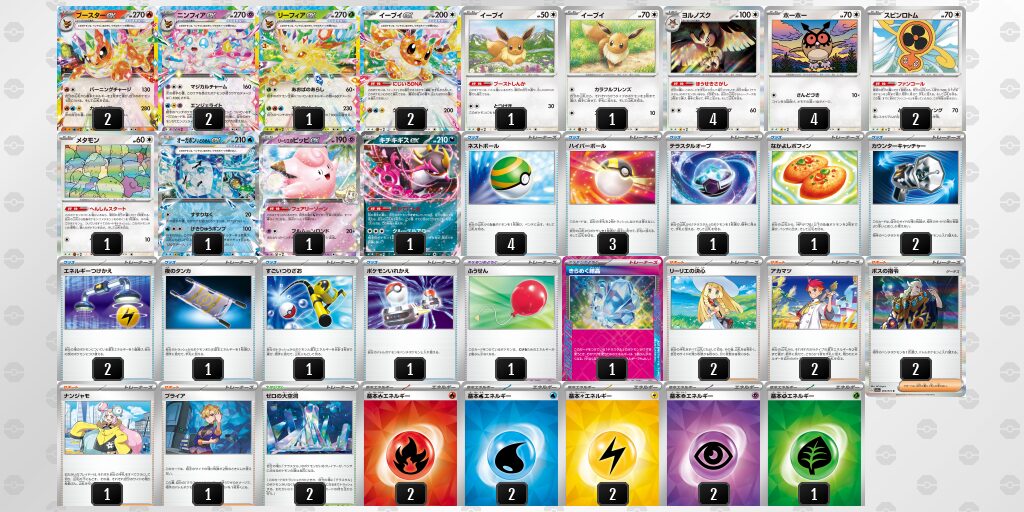 ブイズバレットは、イーブイの進化先にいくつもの分岐があり、対戦相手に合わせて有利となるポケモンexに進化させて戦うデッキです。様々なプランを選択して対戦していくのでデッキを回す難易度は高めですが、練度(デッキに対する知識や理解)を上げていくほど勝利への成果がでやすいデッキです。