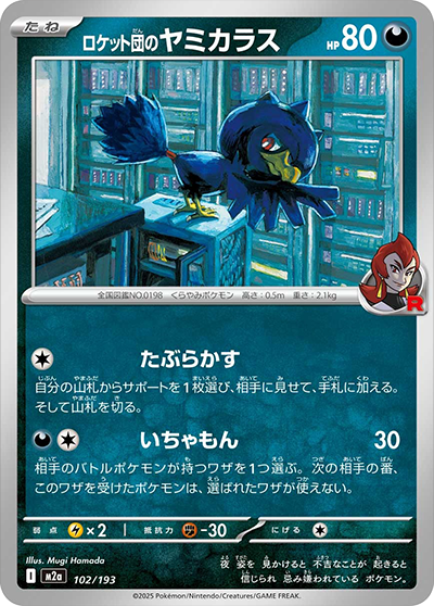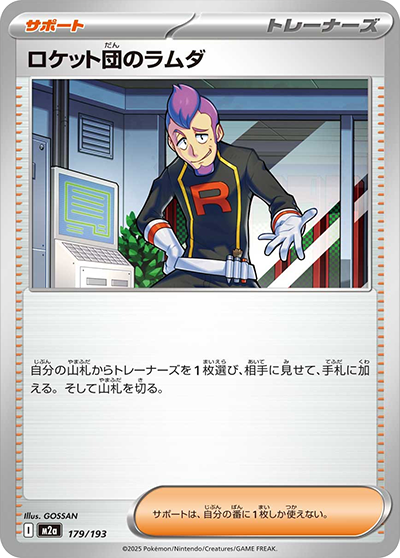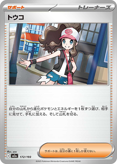 相手の手札からオモテを見ないで1枚選び、トラッシュする。相手の山札を上から1枚トラッシュする。