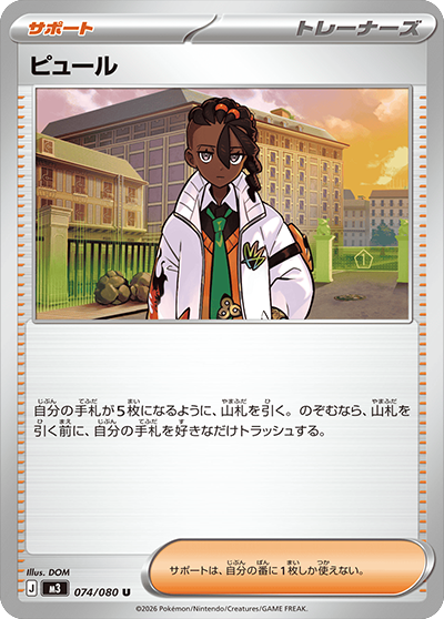 自分の手札が5枚になるように、山札を引く。のぞむなら、山札を引く前に、自分の手札を好きなだけトラッシュする。