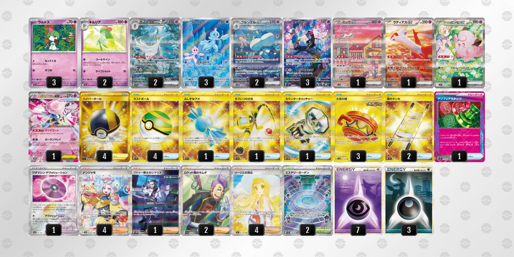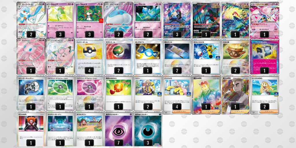 サーナイトexの特性「サイコエンブレイス」が強力で、トラッシュにある基本 基本超エネルギー エネルギーを自分の場の 基本超エネルギー ポケモンに好きなようにつけることができ、主に非エク(ルールを持たないポケモン)をアタッカーにして戦っていきます。