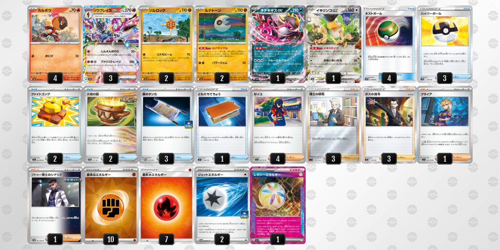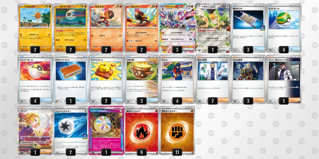 • 序盤は確かに火力が出にくいけど、シティリーグ入賞デッキリストにもあるように、ソルロックとルナトーンを採用すればルナトーンでトラッシュしつつ山札を引けて、なおかつソルロックのコスモビームで序盤に多いたねポケモンのHP約70を一撃で倒せるから序盤はこれで対応できて中盤終盤はソウブレイズexで倒せるからこれで序盤は対応できると思います。