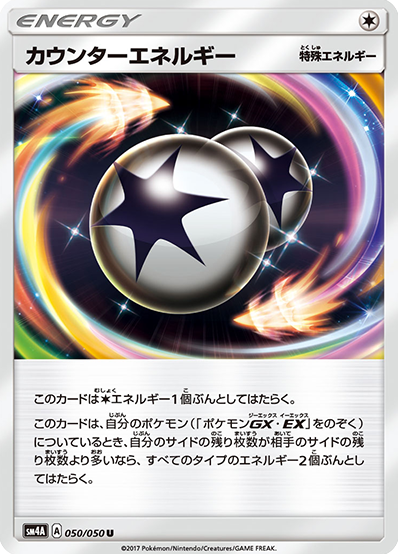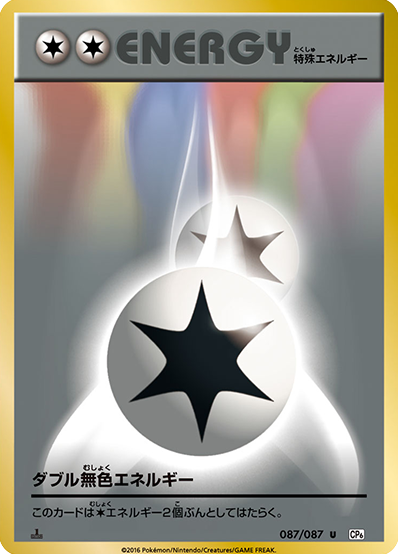 このカードは、自分のポケモン(「ポケモンGX・EX」をのぞく)についているとき、自分のサイドの残り枚数が相手のサイドの残り枚数より多いなら、すべてのタイプのエネルギー2個ぶんとしてはたらく。