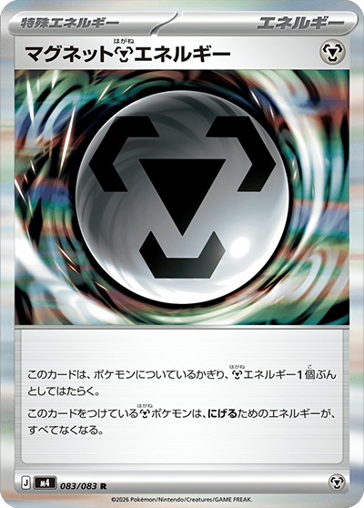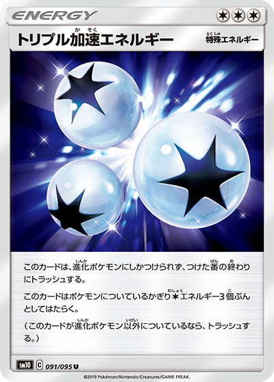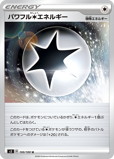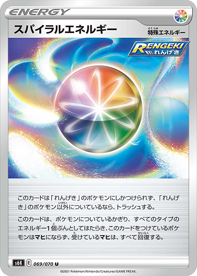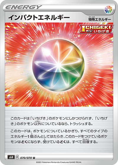 自分のサイドの残り枚数が、相手のサイドの残り枚数より多いなら、このカードは、進化ポケモン(「ルールを持つポケモン」をのぞく)についているかぎり、すべてのタイプのエネルギー3個ぶんとしてはたらく。