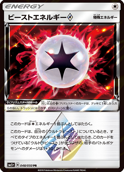このカードは、自分の「ウルトラビースト」についているとき、すべてのタイプのエネルギー1個ぶんとしてはたらき、このカードをつけている「ウルトラビースト」が使うワザの、相手のバトルポケモンへのダメージは「+30」される。
